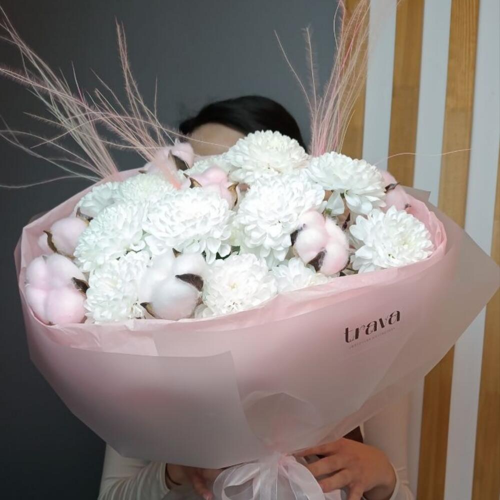 Букет Белый Хит M для девушки хризантема и хлопок в Немане